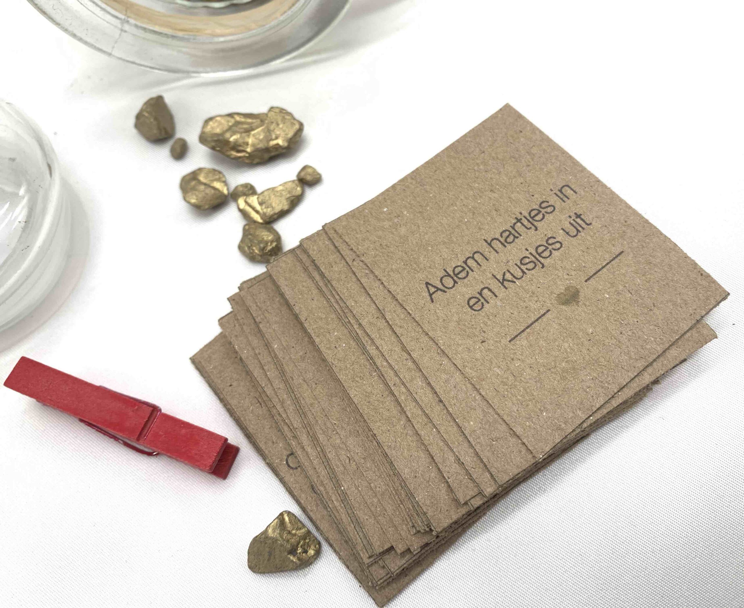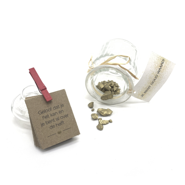 Een prachtig glazen potje met symbolische goudklompjes en 36 kaartjes met opbeurende quotes, de leukste affirmaties & de beste complimentjes.